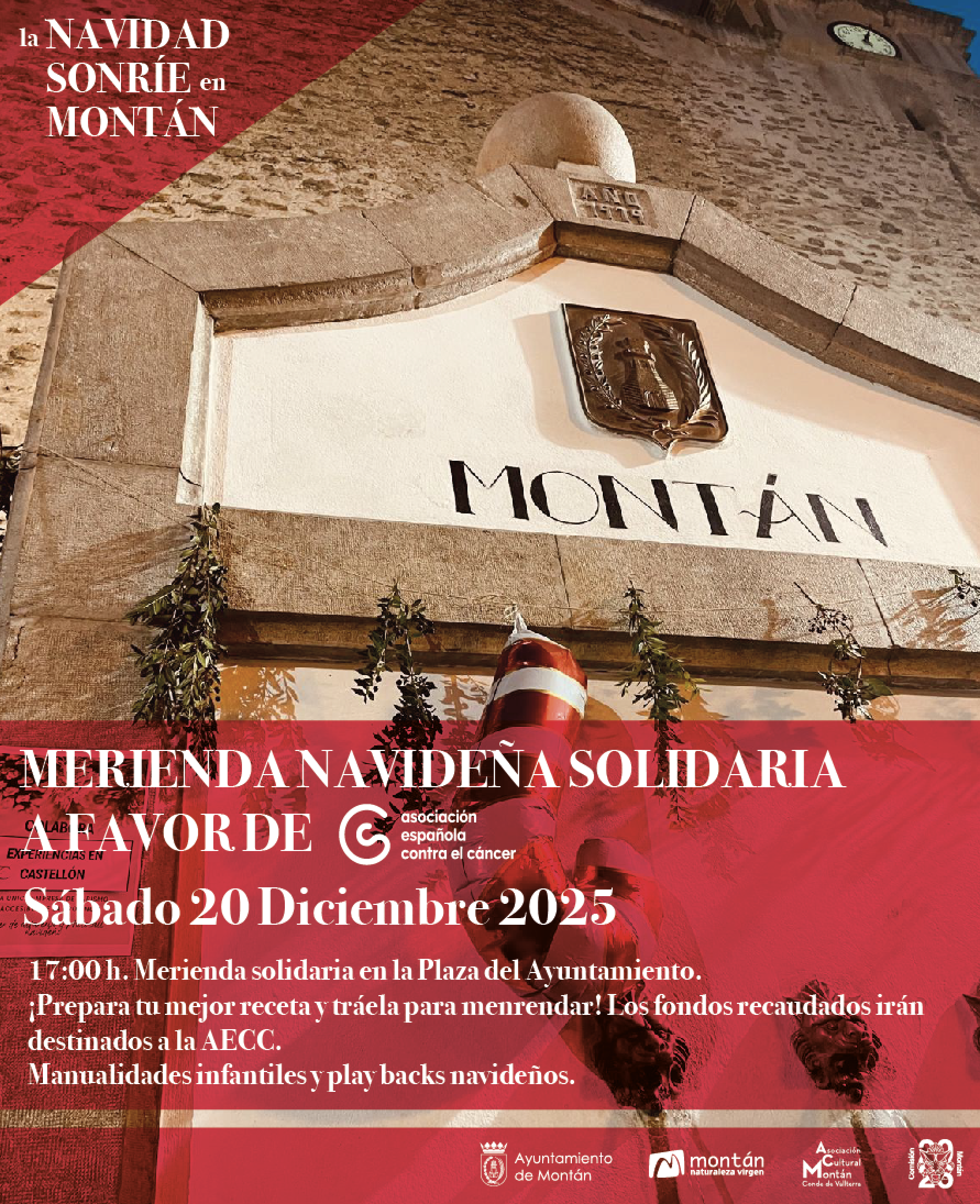 El sábado día 20 tendremos la 𝗠𝗲𝗿𝗶𝗲𝗻𝗱𝗮 𝗦𝗼𝗹𝗶𝗱𝗮𝗿𝗶𝗮 𝗡𝗮𝘃𝗶𝗱𝗲𝗻̃𝗮. Prepara una receta (ya sea dulce o salada) y tráela a la Plaza del Ayuntamiento para merendar. Todos los fondos recaudados irán destinados a la Asociación Española Contra el Cáncer de Castellón. Este año también contaremos con manualidades infantiles y PlayBacks Navideños a partir de las 17:30h., os animamos a preparar vuestro baile navideño o a cantar vuestros villancicos preferidos y mostradlo durante la Merienda Solidaria, ¡No importa la edad que tengáis! ¡Ven a merendar! ¡Es por una buena causa!