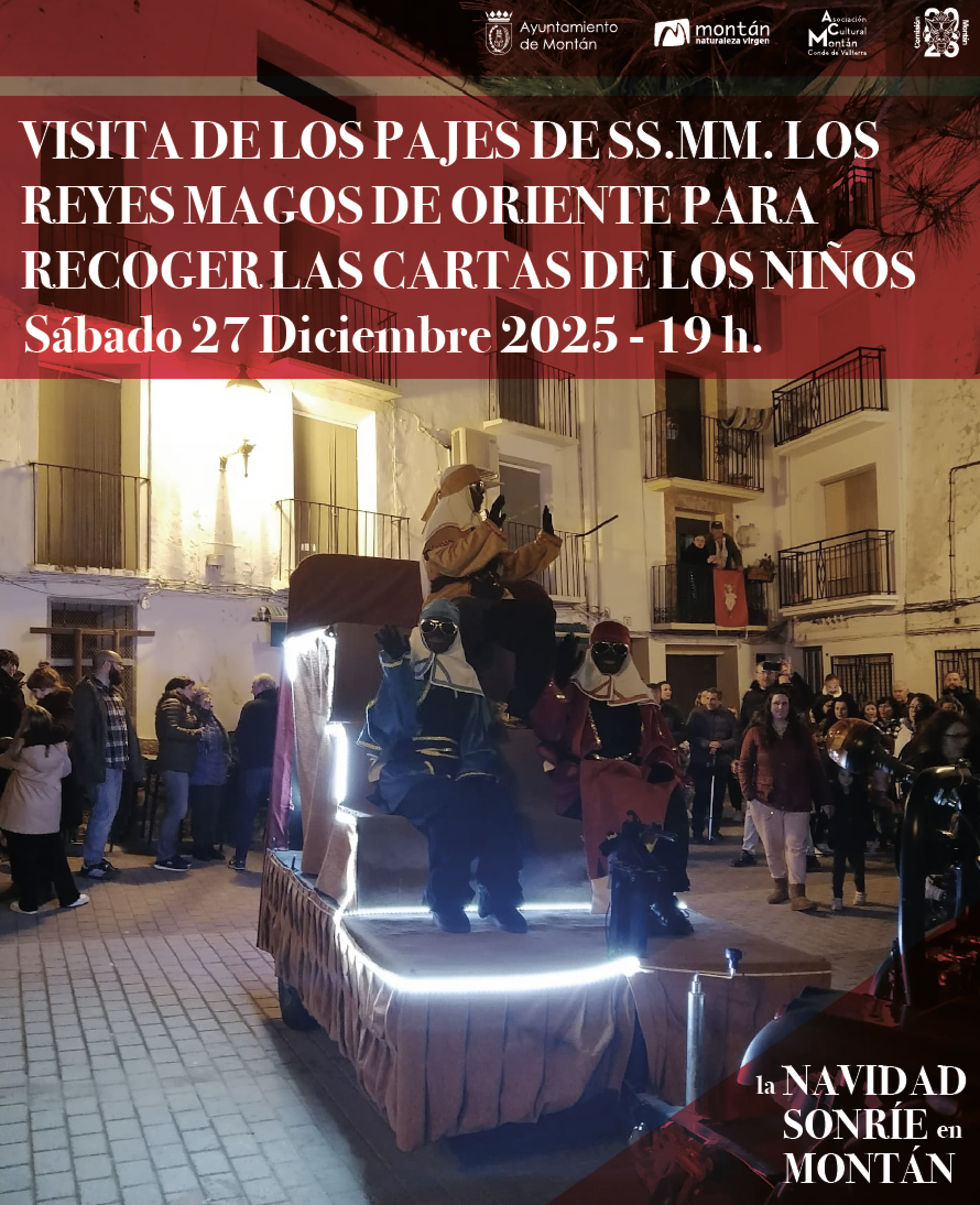 El sábado 27 de diciembre, a las 19 horas, vendrán los Pajes de SS.MM. los Reyes Magos de Oriente, a recoger las cartas de todos los niños y mayores del pueblo, para que así el próximo día 5 puedan venir cargados de regalos.